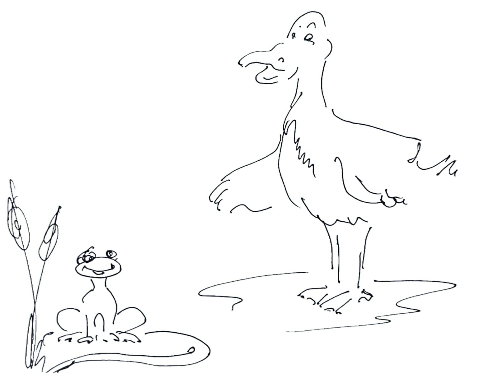 Смех прекратился и из камышей вылез маленький лягушонок. Тут утка вспомнила, что уже видела здесь лягушат и даже сделала им замечание, чтоб не лезли под ноги. Однако, маленькие негодники её не услышали.