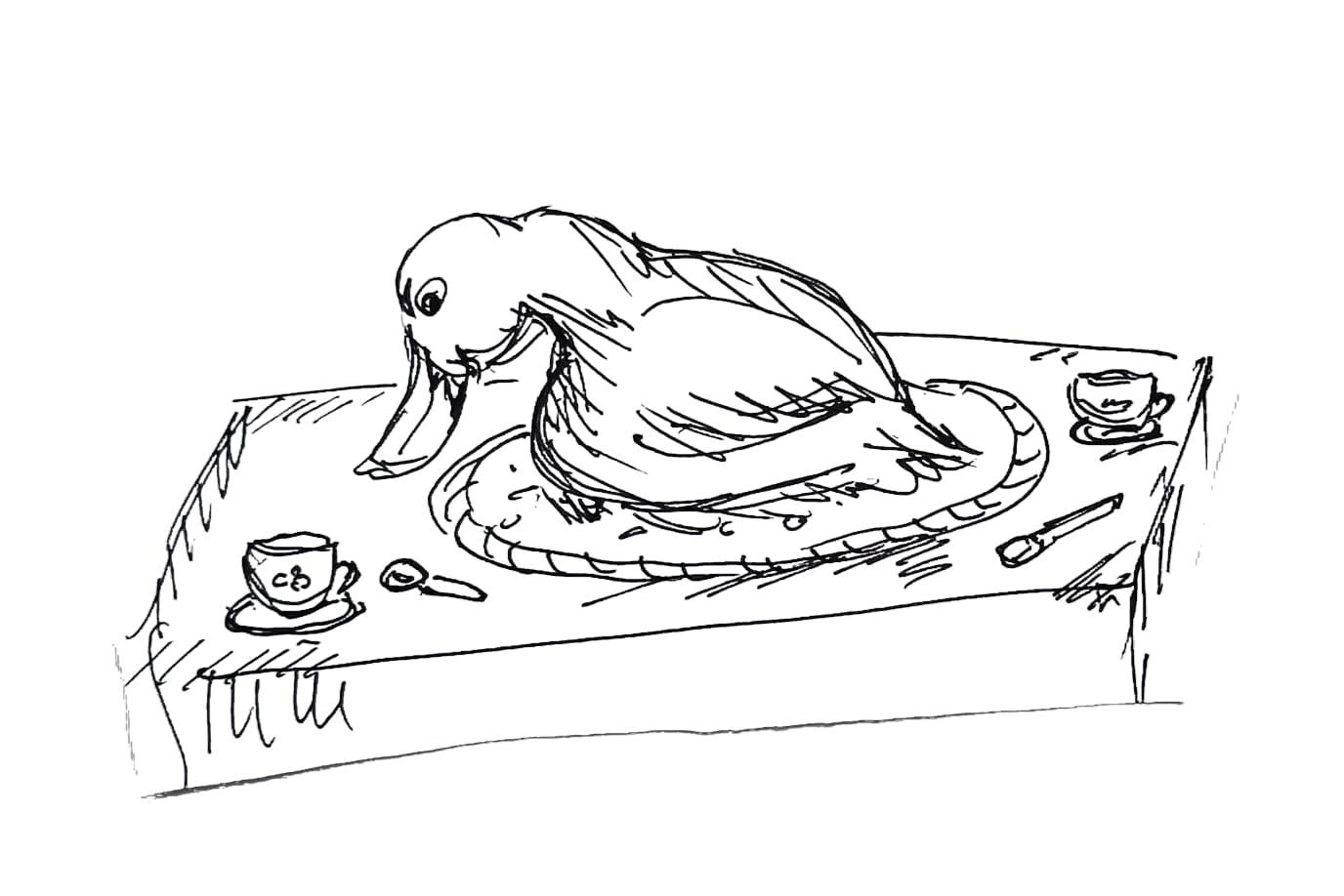 – Как-то на днях, я познакомилась с презабавным господином, – птица влезла на стол и расположилась на блюде с крошками, – Я встретилась с ним на речке…, – замолчала она, перебирая клювом остатки пирога, – Должна сказать, я была удивлена! Очень удивлена. Ведь он… – утка замерла, нацеливаясь на небольшой кусочек, и ухватив лакомство, важно произнесла, – Впрочем, давай по порядку.