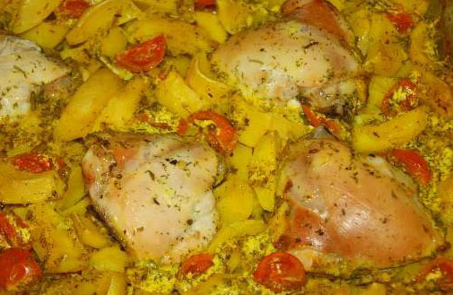 6. Сверху на картофель выкладываем курицу и заливаем остатками маринада.