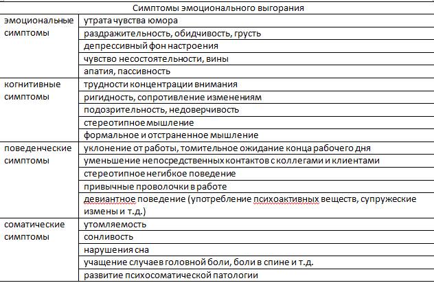 Все симптомы эмоционального выгорания можно сгруппировать следующим образом: