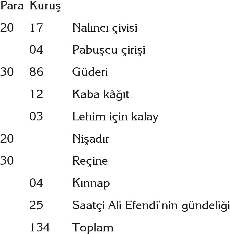 Deneme yarım saat kadar devam eyledi. Orgun sesi gittikçe düzelip artmakta idi. Hamparson Ağa’da memnuniyet son dereceye varıp, “Resmi Efendi! Bunun tamir masrafları her neye varmış olduysa hesabını yapınız da meclise takdim edelim.” deyince, Resmi, “Hesabı pek uzun değildir.” diye koynundan bir cüzdan çıkardı ve oraya, ‘Saatçi Ali Efendi’nin bir gündeliği 25 kuruş.’ diye bir satır daha yazıp yaprağı kopardı, Hamparson Ağa’ya verdi.