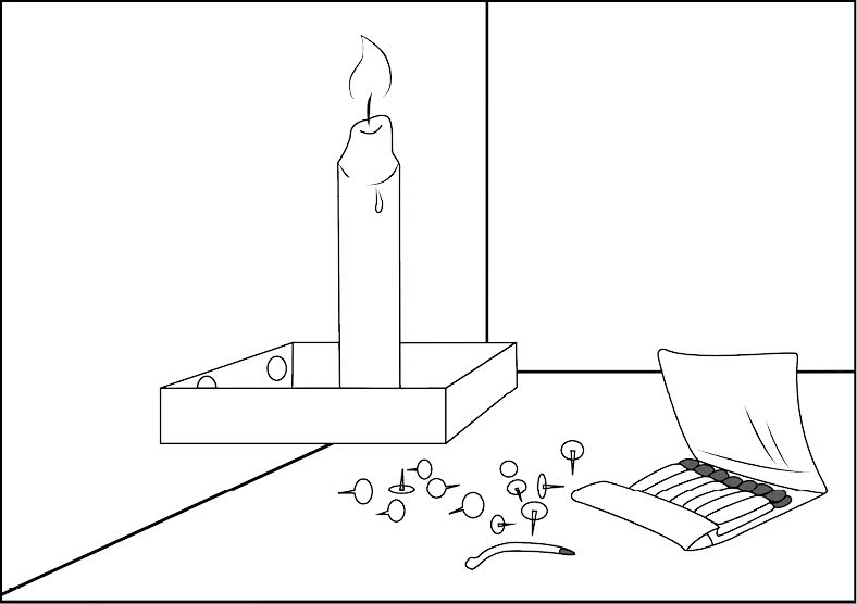 «Некоторые, возможно, уже знакомы с загадкой свечи. Ее придумал в 1945-м году психолог Карл Дункер. Вот как она работает. Положим, я – экспериментатор. Завожу вас в комнату и даю вам свечу, коробку с кнопками и спички. Ваша задача – прикрепить свечу к стене так, чтобы воск не капал на стол. Ваши действия? Некоторые начинают с попытки прикрепить свечу к стене кнопками. Не получается.