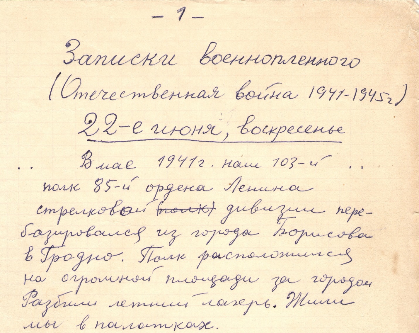 В мае 1941 года наш 103-й полк 85-й стрелковой дивизии перебазировался из города Борисов в Гродно. На огромной площади за городом разбили летний лагерь. Жили мы в палатках.