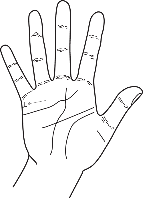 Пример С. (рис. 2). Мужчина был обеспокоен наличием у него короткой линии Жизни. Желая помочь ему, хиромант стал искать признаки непроявленной кармы, выполняя которую он мог бы продлить свою жизнь. У него имелась одна, довольно короткая линия брака, но с веточкой, говорящей о наличии ребенка (дочери). С. рассказал, что они развелись с женой, когда дочери было 2 года, и он редко общается с ними, так как их встречи с женой заканчиваются взаимными упреками и ссорами, хотя дочь он очень любит. Хиромант предложил ему простить все бывшей жене, проявить к ней больше терпения и уважения, а своей дочери дать как можно больше любви. С. правильно воспринял свою карму, так как был готов к этому. И когда его бывшая жена предложила провести совместный уикенд, он понял, что победил. К этому времени его линия Жизни удлинилась, так же как и линия его дочери стала более значимой.