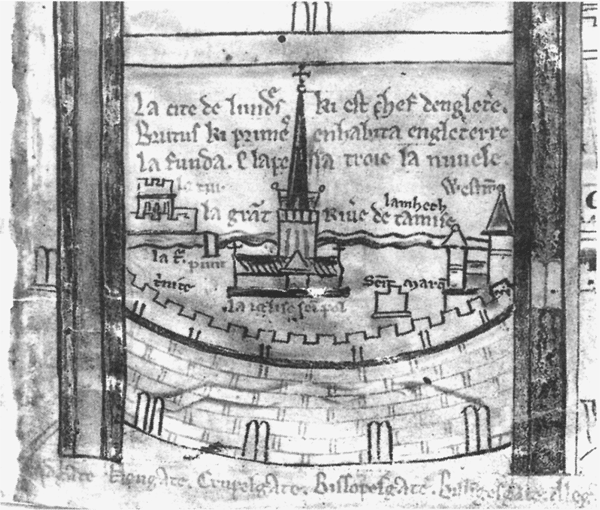 Карта Лондона, выполненная в 1252 г. хронистом и иллюминатором Мэтью Парисом. На ней видны Тауэр, собор Св. Павла и Вестминстер.