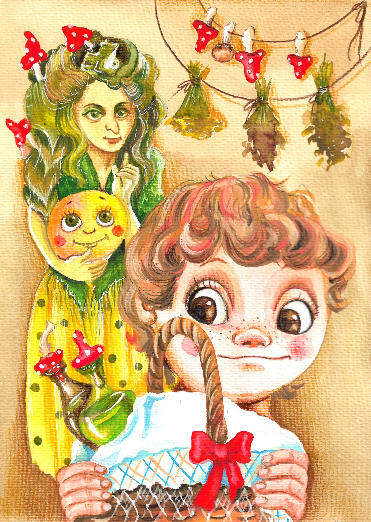 А между тем корзинка уже стояла полнёхонька и даже салфеткой кружевной для красоты накрыта. Из-под белого кружева торчали несколько стеклянных бутылок, заткнутых мухоморами, какие-то пахучие травы, камыш и, кажется, пирожки.