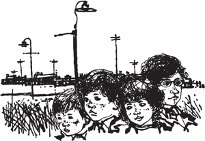 As the children walked past, all the eyes in the street watched them, without interest or hostility, but the children felt very uncomfortable, and walked close together. The girl on the corner laughed, but it could have been at something one of the boys had said.