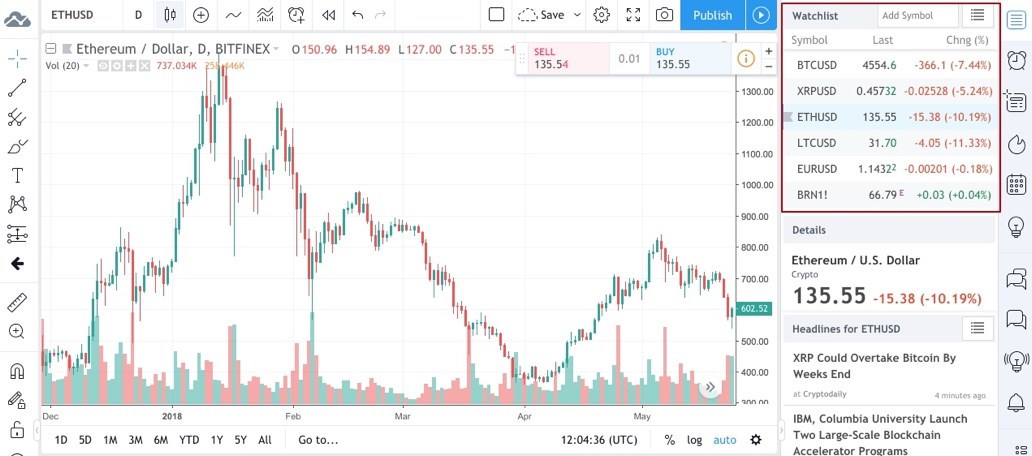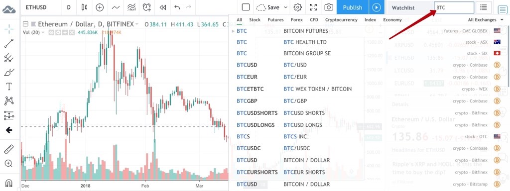 加密货币对位于最左边的角落。时间表在右边。时间框架是形成一个蜡烛线的时间间隔。