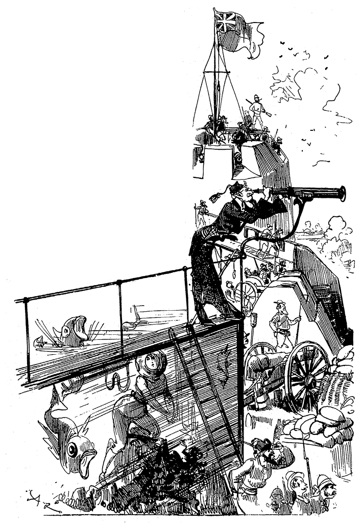 На сей раз надеяться было уже не на что: оставалось только сражаться! В подзорную трубу господин Крокнов наблюдал за тем, как отряд обезьян налетает на батарею и захватывает ее без единого выстрела! Обратившись со стены к своим людям, господин Крокнов призвал их биться до последнего вздоха и, если придется, умереть вместе с ним под руинами аквариума!