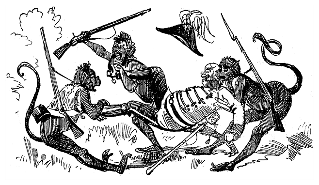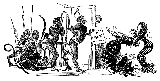 Часа в два пополудни обезьяны начали собираться в конце улицы; господин Крокнов прекрасно различил Сатюрнена I, отдававшего приказы посреди блестящего генштаба. «Ах! – вздохнул директор аквариума. – Будь у меня артиллерия, с какой радостью я обстрелял бы соперника!»