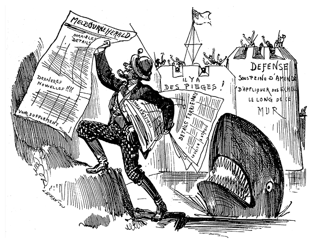 Тут появились несколько уличных продавцов газет со свежим выпуском «Мельбурн геральд». Господин Крокнов подозвал одного из торговцев и попросил у него газету. Паренек еще привязывал листок к сброшенной сверху веревке, когда одна из плававших во рву акул, резко метнувшись в его сторону, попыталась сцапать беспечного незнакомца: к счастью, от испуга бедняга упал, и прожорливому монстру досталась лишь пачка газет, которую он, за неимением лучшего, и проглотил.