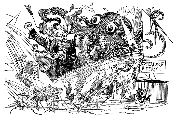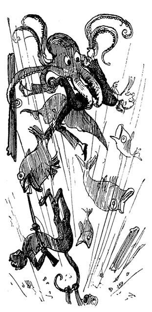 Страшной силы толчок сотряс пол, раздался ужасный взрыв, полыхнул огонь… и аквариум взлетел на воздух!.. Стены, бассейны, рыб, обезьян – да все здание и всех тех, кто в нем находился, – разнесло на куски, разлетевшиеся в радиусе примерно мили от места взрыва. Несчастный Крокнов и его бедный спрут, как и были – в обнимку, сгинули в самом эпицентре огненного смерча.