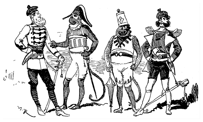 ПОЛКОВНИК-КВАДРУМАН ВА-ВО-ВА НОВОГВИНЕЙСКИЙЛучший из квадруманов. Простой, грубоватый, честный. Прямая натура; всегда любезен, временами весел. Вождь одного из крупнейших обезьяньих племен Океании, близкий сородич той трибы, в которой прошло детство его величества Сатюрнена I. Поэтому контингент, предоставленный Ва-Во-Ва, – один из самых многочисленных. Обезьяны этого отважного командира образуют, так сказать, линейные войска фарандулийской армии. И пусть они действуют не так блестяще, как солдаты передового отряда или «вольтижеры» полковника Унгко, их главным достоинством является надежность – как сказали бы старые вояки, в них видна основательность!