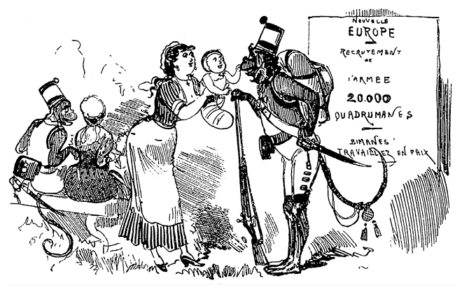 Нам нет нужды возражать против столь гнусных клевет – квадруманское иго, напротив, было чрезвычайно легким для фарандулийского народа, и, вместо того чтобы посредством смешанных браков добиваться слияния биманской и квадруманской рас, Фарандуль упорно отказывал полковнику-бретонцу Трабадеку в разрешении на брак с одной юной и прелестной квадруманкой, дочерью полковника Ва-Во-Ва.