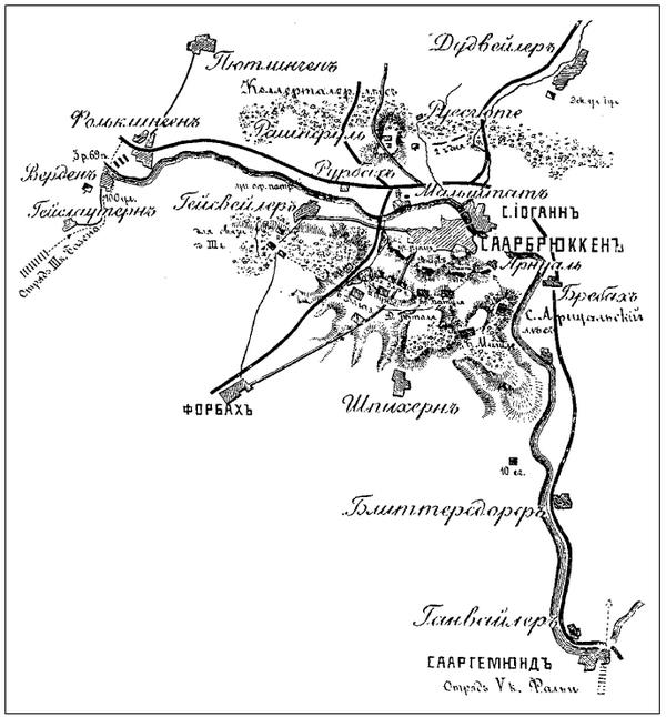 Сам император со своим принцем присутствовали при этом предприятии. 3-й корпус наступал против Фельклингена, 5-й – через Сааргемюнд, 2-й – на Саарбрюккен.