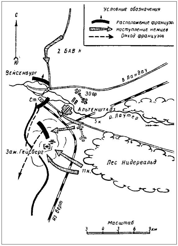 Уже рано утром на правом крыле баварцы натолкнулись на энергичное сопротивление перед стенами Вейсенбурга. Однако вскоре прусские корпуса перешли Лаутер ниже. Генерал Бозе повел 11-й корпус на Гейсберг в охват правого неприятельского крыла, тогда как генерал Кирхбах с 5-м корпусом наступал на фронт противника. Тем временем 30 орудий выехали против вокзала в Вейсенбурге. В кровопролитном бою был взят этот вокзал, а затем и город.