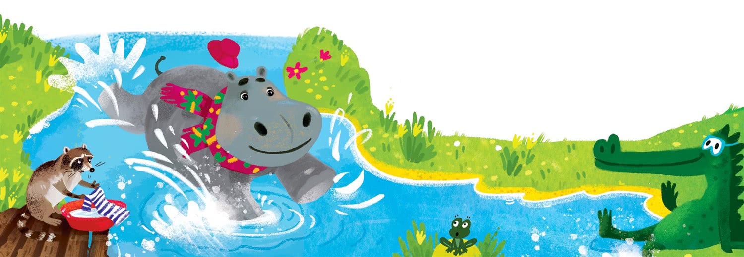 Путь преградила речка. Бегемот так спешил, что сбил с ног Енота-полоскуна, который стирал у брода свою полосатую рубаху.
