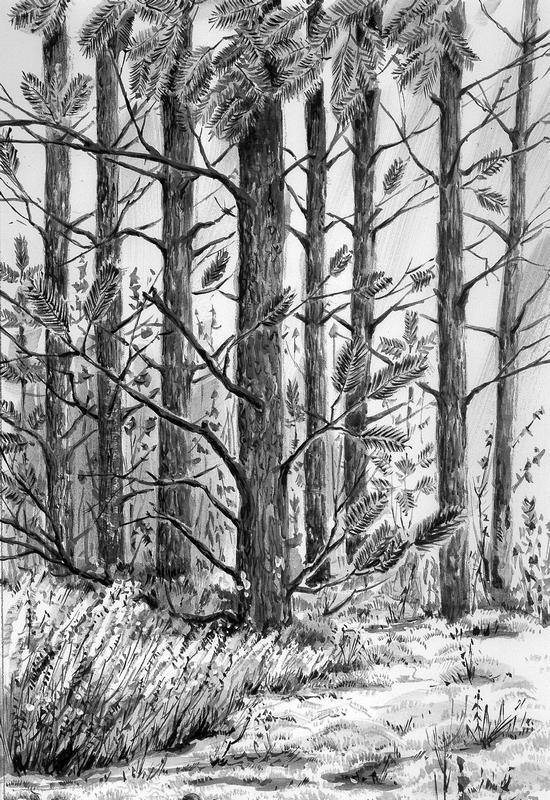 Лес стоял дремучий, страшный, безжизненный. Хоть бы где каркнула ворона или промелькнул заяц! Верхушки деревьев проросли друг в друга и соединились в плотную крышу. В дебрях чудилось, что на землю опустились густые сумерки; но заходил я в этот лес с нежно-зеленой солнечной поляны, при чистейшем голубом небе, поляну окружали пестроствольные молодые березы, четыре из них собрались отдельно и, взявшись за руки, водили хоровод.