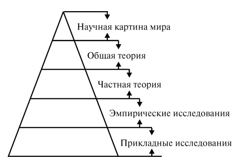 Самый абстрактный уровень знания отображает научная картина мира. Вслед за ней размещаются более конкретные уровни знания, называемые общетеоретическим и частнотеоретическим. На этом заканчивается сфера теоретического знания и начинается область эмпирического. Она включает 2 типа исследований – собственно эмпирическое и прикладное исследование.