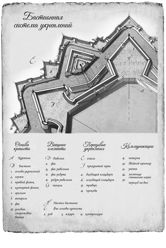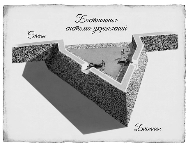 Предположим, что войска неприятеля решили атаковать бастион. Его пятигранная форма была выбрана отнюдь не случайно. Вражеские солдаты будут вынуждены штурмовать один из фасов, наружных сторон бастиона. Какой бы из них они ни выбрали, солдаты с соседнего бастиона будут прикрывать своим огнем товарищей. Пока длится наступление, со стен и бастионов на солдат неприятеля обрушится град пуль и камней, выльются тысячи литров горючих жидкостей.
