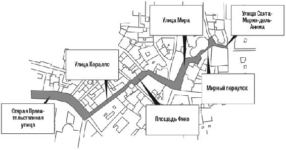 * * *Теперь направляйтесь по Старой Правительственной улице (via del Governo Vecchio) до перекрестка с улицей Коралло (via del Corallo) и по ней продолжайте движение налево, пока не окажетесь на небольшой площади Фико (piazza del Fico, буквально – Инжирная). Там, кстати до сих пор растет инжирное дерево. Пересеките площадь правее, по диагонали, до начала улицы Мира (via della Pace). Через несколько метров она приведет вас к повороту налево, к церкви Санта-Мария-делла-Паче, которую возвели в 1482-м по приказу Сикста IV в память о чуде. В этом месте древний образ Мадонны Мира (Madonna della Pace) после удара камнем закровоточил. Под впечатлением от явления папа дал обет: если заговор Пацци во Флоренции[8], в который он тоже был замешан, не приведет к ожидаемой с содроганием войне, то он построит здесь храм в честь Богоматери.