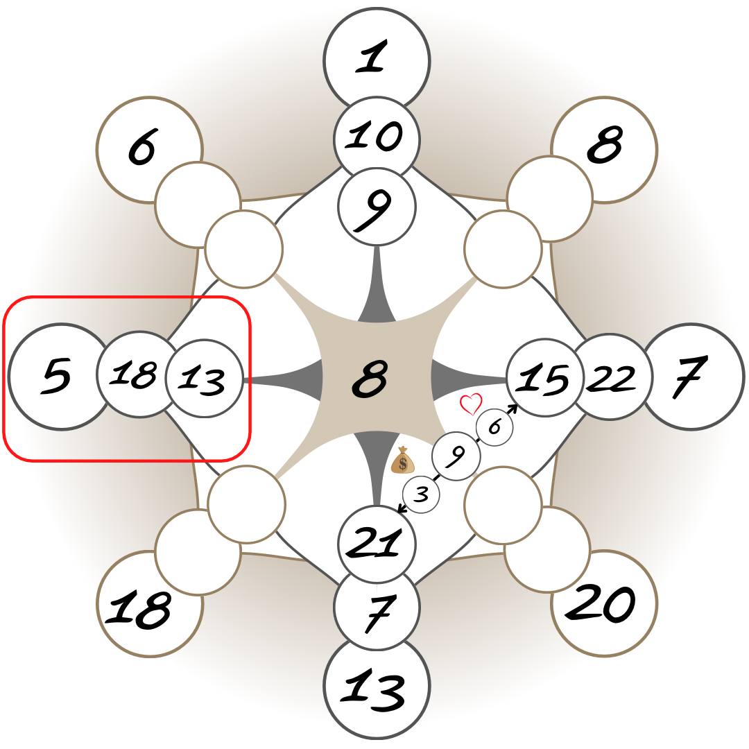 Первая энергия в ключе (на рисунке это 5) расскажет нам о том, для чего ваша душа пришла к родителям. Вторая энергия (на рисунке это 18) – задача отношений. Третья энергия (на рисунке это 13) – ошибки во взаимоотношениях с родителями и своими детьми.