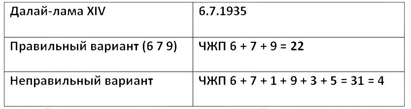 В правильном варианте расчета ЧЖП 22 – это руководитель крупных проектов. И это максимально точно показывает стратегическую задачу Далай-ламы XIV. В неправильном варианте расчета ЧЖП 4 – это более простая цель.