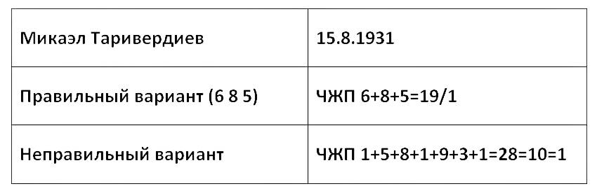 В неправильном варианте расчета было упущено число кармического долга 19. Это злоупотребление властью в прошлой жизни. Практически всегда человеку с такой характеристикой предстоит неожиданный разрыв отношений. Многим известна история с Микаэлом Таривердиевом, положенная в основу художественного фильма «Вокзал для двоих». Герой берет на себя вину своей супруги за автомобильную аварию со смертельным исходом. Пока он отбывает срок в тюрьме, партнерша от него уходит. У Микаэла Таривердиева была подобная ситуация, хотя детали все же несколько другие. Нам сейчас важно увидеть именно отработку кармического долга 19. Вибрация числа 9 срабатывает как завершение отношений.