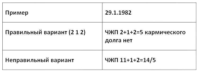 Как видите, для даты 29.1.1982 в неправильном варианте расчета появилось число кармического долга 14.