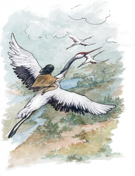 – Садись, маленький братец, ко мне на спину, – сказал самый большой и сильный журавль. – И держись крепче, – предупредил заботливо вожак стаи.