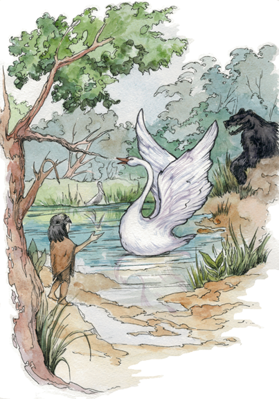 И вот из чащи леса показалась росомаха. Внимательно оглядевшись и потянув носом воздух, она припала к земле так, чтобы её не было видно и начала подкрадываться к лебедю. Осторожно, стараясь двигаться как можно тише, она добралась до края проруби. До лебедя оставалось, как говорится, рукой подать. Как же его ухватить? Она решила дотянуться до него хотя бы одной лапой. Вытянувшись как можно дальше, протянула свою когтистую лапу к стройной лебединой шее. Мгновение – и лебедь стремительно выпрямился. Росомаха получила сильнейший удар клювом по носу. Это неожиданное нападение буквально ошеломило ее. От боли и злости шерсть на росомахе стала дыбом и, забыв обо всём на свете, страшно захрипев, она готова была уже броситься за Ратибором в воду.