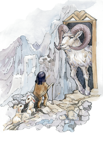 Солнышко уже совсем скрылось за горами, когда друзья подошли к дому дядюшки Архара. Дверь им открыл могучий горный козёл с такими огромными рогами, что было удивительно, как он носит такую тяжесть.