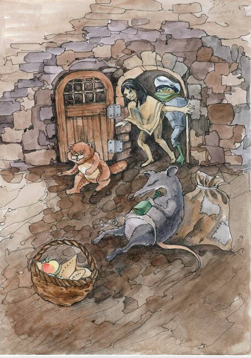 Грумио, так звали бобрёнка, взял корзиночку с едой и отправился к путешественникам. Часовой отомкнул засовы и Грумио зашёл в камеру узников. Дверь сразу же закрылась.