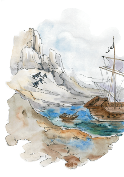 Пираты налегли на вёсла, и лодки направились к берегу. Вскоре лодка, зашуршав днищем по песку, остановилась. Разбойники выскочили на берег и, прихватив с собой пленников, направились к подножию огромной чёрной скалы.