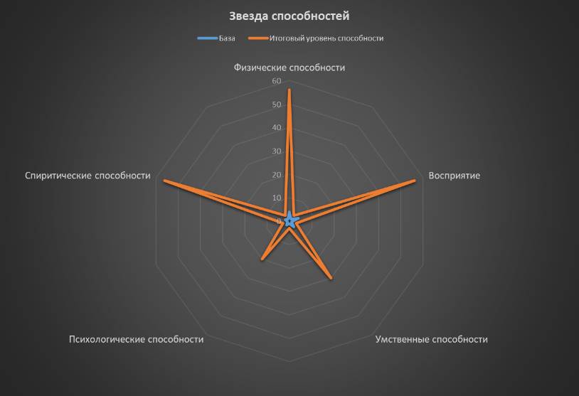 Основные характеристики: физические способности – 33-й уровень; восприятие – 47-й уровень; умственные способности – 45-й уровень; психологические способности – 26-й уровень; спиритические способности – 56-й уровень.