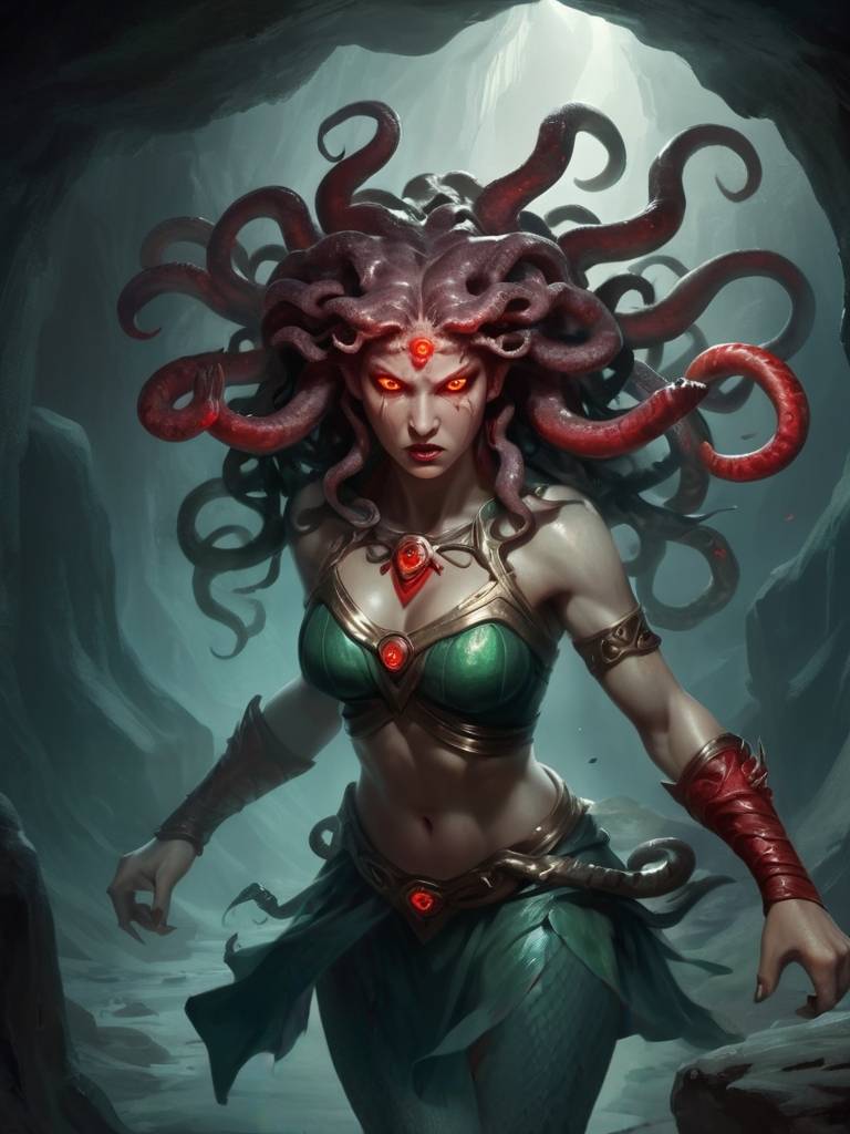 Это была Медуза. Однозначно. Но вместо змеиных голов на… волосах там были хвосты. Множество-множество хвостов, которые постоянно двигались. Они постоянно переплетались между собой и в свете Гелиоса даже слегка отблескивали. Это выглядело не то что приятно… да кого я буду обманывать? Это выглядело достаточно отвратно.