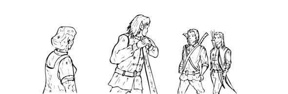 Вдруг, откуда-то сверху, с деревьев спустились три Эльфа. Все трое были одеты в зелёные плащи с капюшонами. В руках были луки. За спиной – стрелы. Один из них подошёл к Эльфу, оказавшемуся у них в гостях.