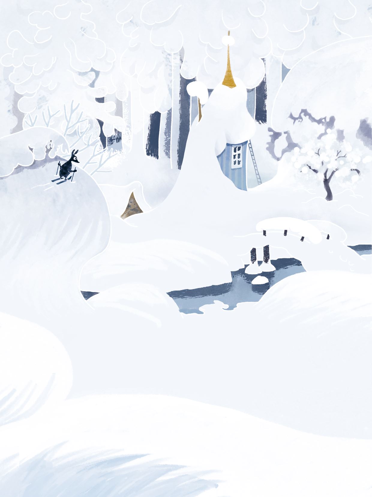 В Муми-доле зима. Море спит подо льдом, маленькие букашки спят под землёй, муми-тролли спят под одеялами и видят длинные зимние сны.