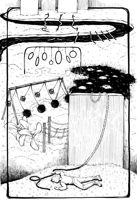Я соскользнул с первой же, на которую попытался встать ещё у берега. Пробарахтавшись в грязи и ряске в попытках оседлать хоть одну кочку, я наконец вылез к пропеллерам и маятникам, решив, что они-то меня и прикончат. Но, как ни странно, очень быстро рассчитал интервалы их вращений и махов и дальше просто нёсся между ними, боясь только одного, что поскользнусь и тогда точно получу пинка, не успев отбежать вовремя.