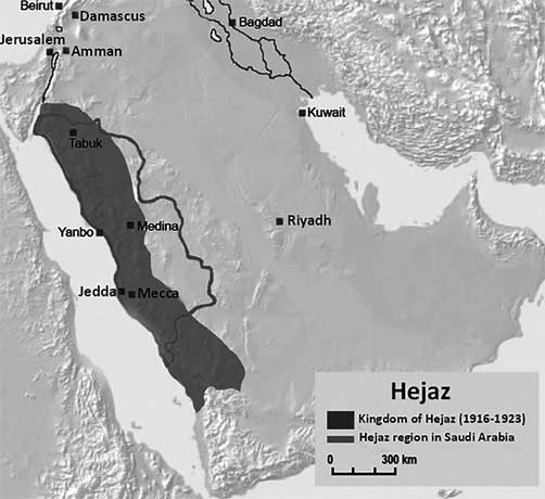 Темным цветом вдоль побережья Красного моря выделена территория королевства Хиджаз (автор карты Martin Collin)