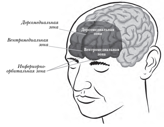 Каждая зона, отмеченная на картинке, ответственна за конкретный набор функций. Центральные берут под контроль внутреннее состояние человека. Боковые отвечают за внешние факторы. Если проследить вдоль центральной оси ПК, нижние части отвечают за эмоции, боковые – за мыслительную активность. Основная линия их разграничения находится между дорсолатеральной и вентромедиальной зонами (между верхне-боковыми и средне-нижним участками). Последняя берет на себя эмоции, контроль импульсивности поведения и мотивацию поступков. Со стороны может сложиться впечатление, будто определение вентромедиальной зоны как «эмоциональной» непоследовательно, поскольку я отмечал, что за эмоции в нервной системе несет ответственность лимбическая система. Можно сказать иначе: вентромедиальная зона ПК «думает» об эмоциях, тогда как лимбическая система «испытывает» их. Дорсолатеральная больше концентрируется на внешнем мире и отвечает за планирование и принятие решений.