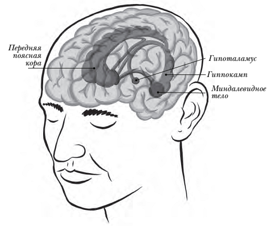 Мы упомянули, что префронтальная кора головного мозга значительно развилась в процессе эволюции. А вот лимбическая система состоит из «древних» частей, которые находятся ниже коры (кстати, у ранних млекопитающих, живших миллион лет назад, была лимбическая система). Она отвечает за эмоции и возникновение таких чувств, как возбуждение, страх, тревога и желание, а также участвует в создании эмоциональной памяти. Лимбическая система состоит из четырех органов: гипоталамуса, миндалевидного тела, гиппокампа и поясной коры. Гипоталамус берет под контроль стрессовые состояния. Миндалевидное тело участвует в преодолении тревог, страхов и других негативных эмоциональных состояний. Гиппокамп отвечает за формирование долговременной памяти, а так как его нейроны весьма чувствительны к стрессу, он нередко играет роль сигнализатора в глубокой шахте депрессии. Поясная кора отвечает за внимание и концентрацию – это необходимые качества для преодолений депрессивных состояний. Умение сосредоточиться – из-за выработанной привычки или благодаря усилию воли – очень важно для позитивных изменений в настроении.