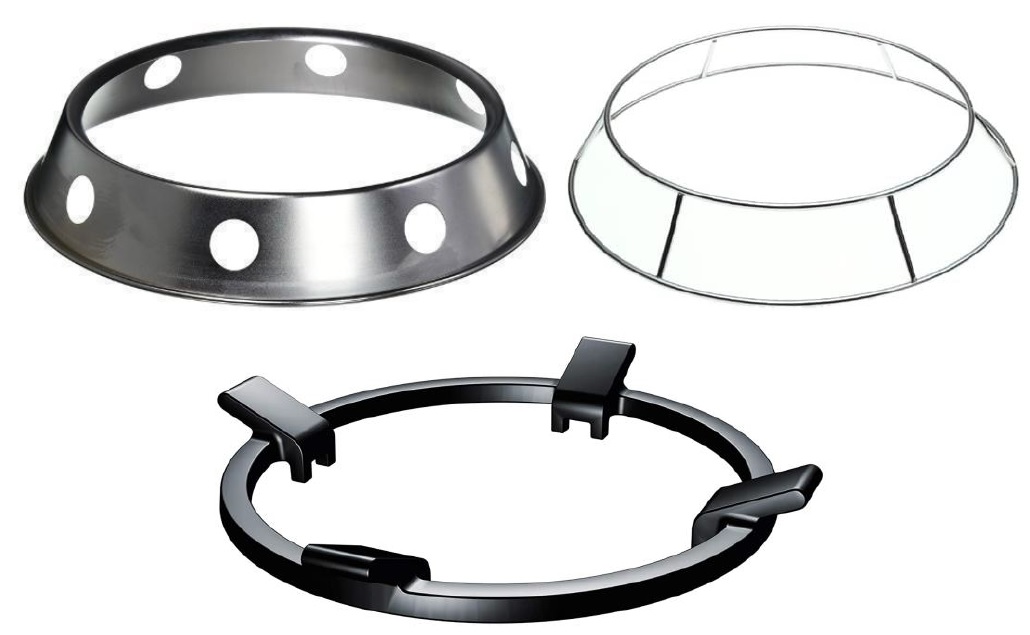Он представляет собой куполообразное металлическое кольцо, которое устанавливается по всему периметру горелки на вашей газовой плите. На этом кольце размещены отверстия, которые позволяют перенаправить поток газа, а также изменить пламя, превращая его в непрерывную струю постоянно поступающей тепловой энергии. Данный аксессуар помещается сверху горелки и фиксируется решеткой от конфорки, сверху которой располагается стабилизатор для фиксации и устойчивости круглодонного вока.