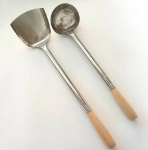 Эта кухонная утварь считается лучшим помощником при обжаривании методом стир-фрай. Ковш удобен и отлично соответствует кривизне круглодонного вока, в то время как лопатка чаще всего используется для плоскодонных воков. При обжаривании методом стир-фрай ковш располагают вниз “лицом”, что помогает при перемешивании продуктов. Лопатка удобна, когда необходимо перевернуть ингредиент для равномерного обжаривания, например, креветки.
