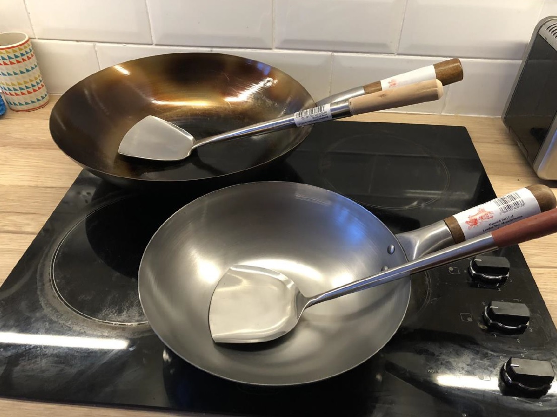 Пример плоскодонного вока из углеродистой стали для домашнего использования на электрической плите: новый и готовый к использованию после прокаливания.