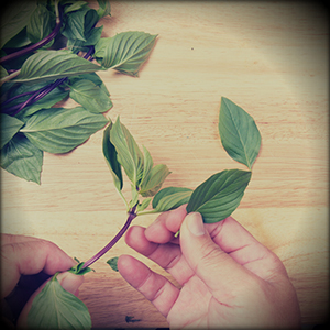 Для того, чтобы отделить листья у трав с мягкими стеблями, например, кинзы, петрушки, укропа, фенхеля или базилика, следует удерживать твердый стебель одной рукой, а другой по обеим сторонам стебля общипывать листья. Листья на древесных стеблях отделяют от основания к верхушке: придерживают одной рукой основание стебля, а пальцами другой руки счищают листья со всего стебля двигаясь по направлению к его кончику.