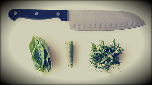 Также в обиходе поваров и кулинаров имеется техника шинковки свежих трав тонкой полоской. Для этого необходимо сложить листья, например, базилика, мяты или орегано, небольшой стопкой и скрутить ее в трубочку как можно плотнее. Расположить скрученную стопку листьев на разделочной доске и крепко удерживая трубочку нарезать ее поперек тонкими полосками.