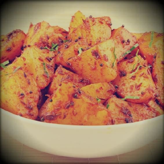 Нагреть масло в сковороде вок или другой тяжелой сковороде на среднем огне. Добавить асафетиду, панч фарон и картофель, и хорошо перемешать. Готовить на среднем огне до полуготовности картофеля. Добавить куркуму и продолжать обжаривать картофель до полной его готовности.