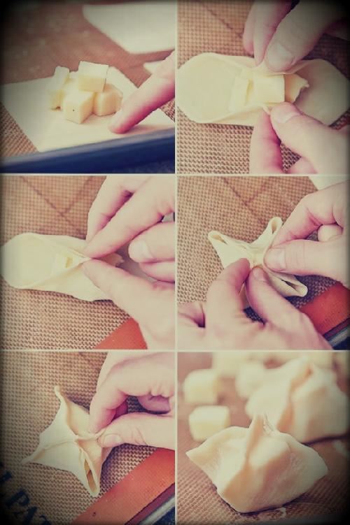 Для наполнения вонтонов следует работать партиями по 6–8 шт, предотвратив при этом высыхание теста. Поместить тесто на рабочую поверхность. В середину каждого квадратика выложить 1–2 ч.л. начинки, приблизительно 18–20 гр, в зависимости от размера теста. Используя кулинарную кисточку смазать взбитым яйцом края теста. Вначале сомкнуть два противоположных угла теста вместе, а затем также поступить с двумя другими углами, создав из вонтона конус. Переложить готовый к обжариванию вонтон на большое блюдо и проделать тот же процесс с оставшимся тестом до тех пор, пока не закончится начинка.