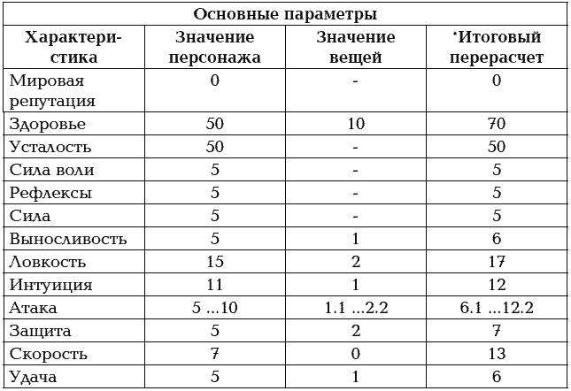 * Итоговый перерасчет не является просто суммой значений персонажа и вещей. Из-за того, что одни параметры могут отвечать за значение соседних, перерасчет проводится с учетом этих связей и носит более сложный характер.